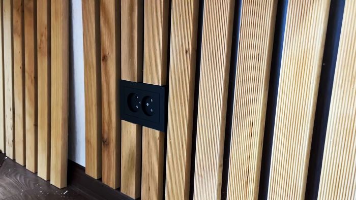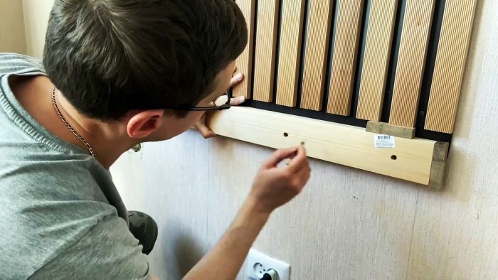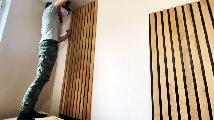 Готовая панель прикручивается к стене точно вертикально. Для удобства ее можно сделать из двух половин. В таком случае у второй первая рейка будет прикручиваться с отступом на необходимый зазор. Шляпки саморезов закрываются черными наклейками.