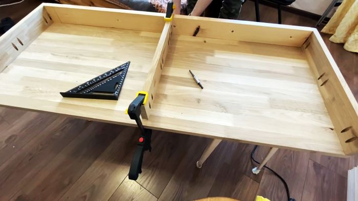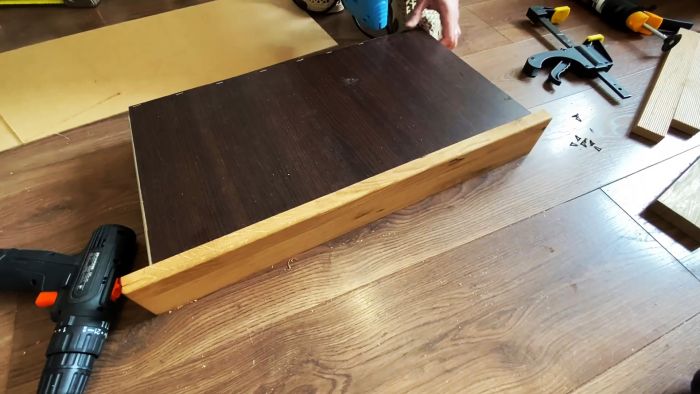 На ящики устанавливаются фасады из щита. Их следует поджать к рамкам струбцинами, а потом прикрутить изнутри. Зазор между двумя фасадами нужно постараться сделать минимальным.