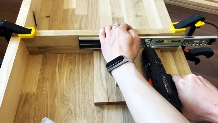 Под столешницей устанавливается поперечная перемычка для крепления ящиков. На боковины и к ней закрепляются шариковые направляющие с доводчиками.