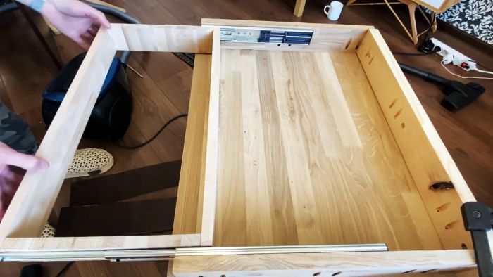 Далее нарезаются заготовки для ящиков. Они собирают в рамки, которые прикручиваются к направляющим с учетом зазоров.
