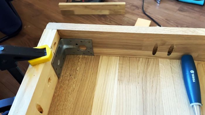 Затем нужно укрепить стол усиленными монтажными уголками изнутри. После этого он прикручивается к стене анкерами пока без ящиков. Они монтируются следом.