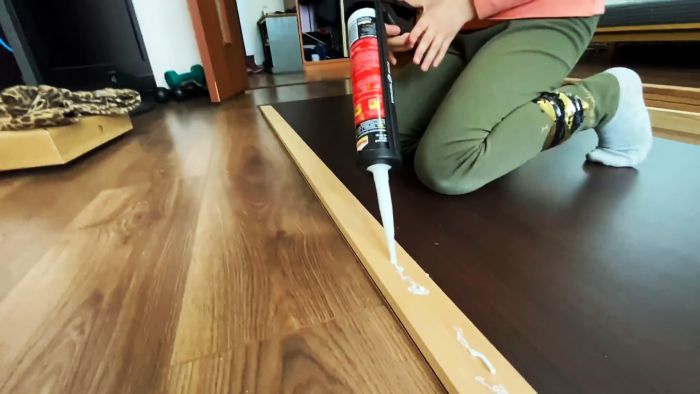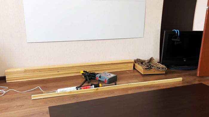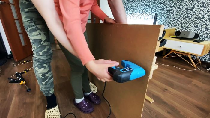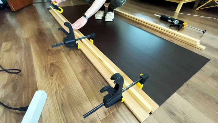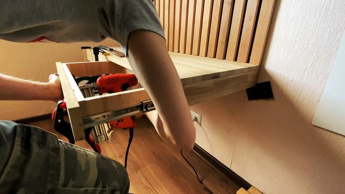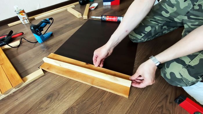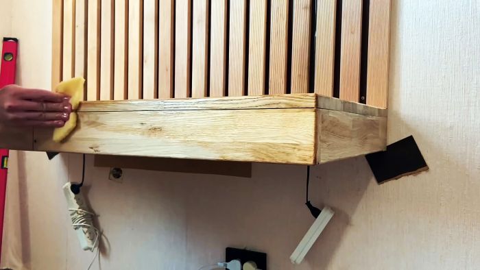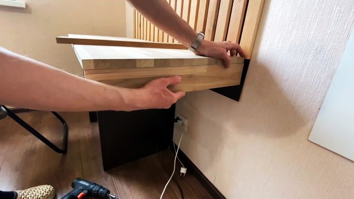 На основание панели из ДСП вертикально приклеиваются рейки, и прибиваются с обратной стороны скобами. Однако длина реек должна перекрывать ДСП не полностью, а доходить только до начала будущей столешницы. Зазоры между рейками можно соблюдать, прикладывая такую же рейку боком.