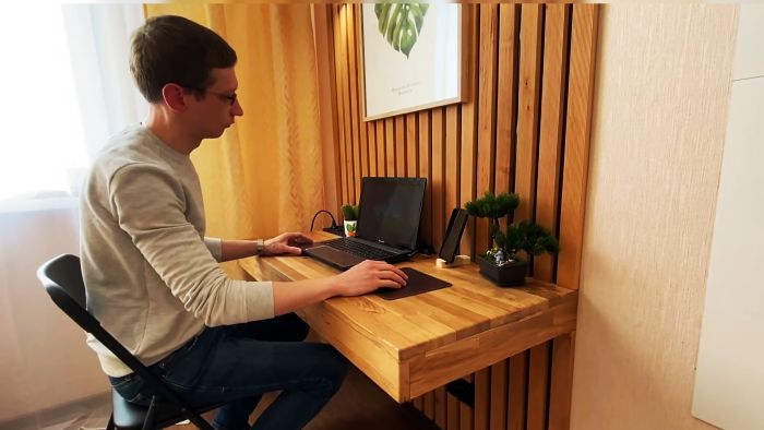 В небольших квартирах и домах нет возможности выделять отдельное помещение для рабочего кабинета. В таком случае выручает зонирование пространства. Рассмотрим, как можно оформить рабочий уголок с парящим компьютерным столом без громоздких ножек, мягкой подсветкой и настенными рейками.
