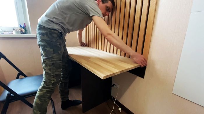 На стене размечается горизонтальная линия, по которой будет располагаться столешница. Она размещается на высоте, зависящей от роста пользователя, а именно рекомендаций по ГОСТу. К примеру, для человека 175-185 см стол должен быть высотой от 70 до 80 см. После этого можно заняться сборкой декоративных стеновых панелей. Они изготавливаются из ламинированного ДСП черного цвета. Ширина панели должна соответствовать столешнице. Высота делаете от потолка до низа будущего стола с учетом толщины.
