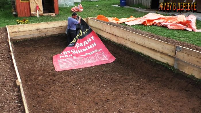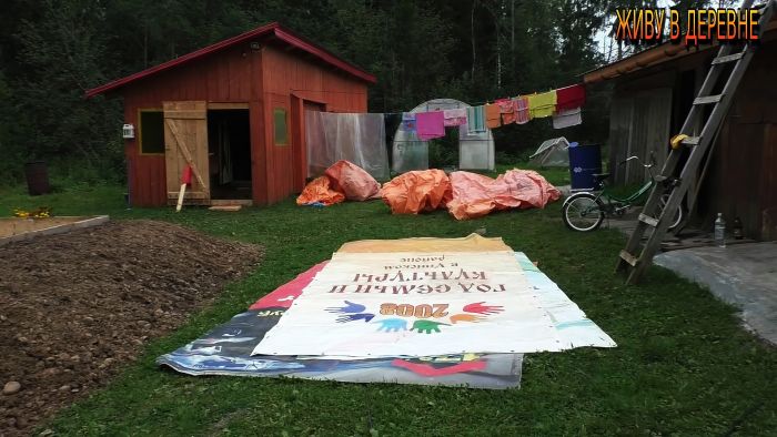 Затем следует обшить каркас изнутри б/у баннеров, чтобы сгладить острые углы досок и ступеньки между ними. Вместо рекламных тентов подойдут белые мешки, агротекстиль и другой подобный материал.