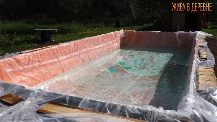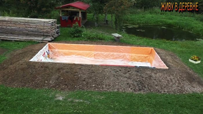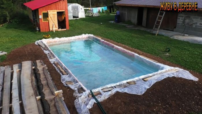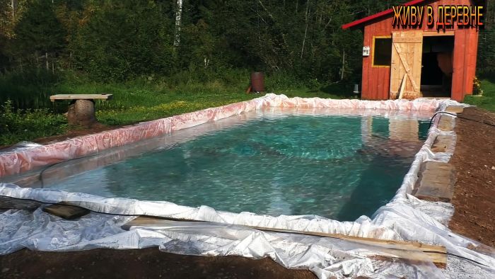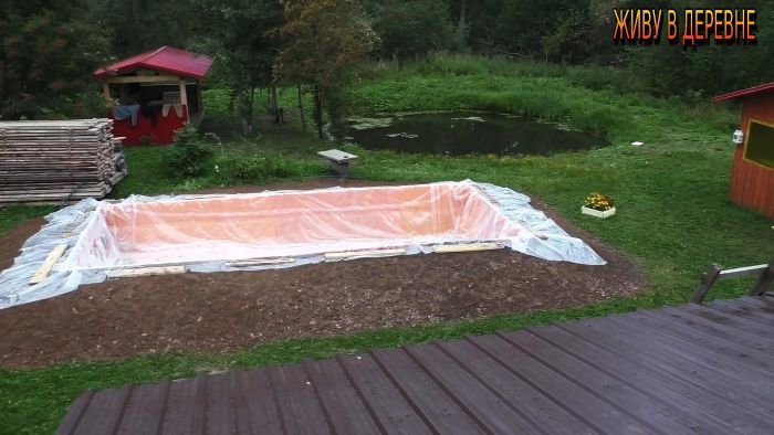 Готовое большое полотно укладывается на чашу, расправляется в углы, после чего края придавливаются за бортиками досками. Далее бассейн можно заполнять водой. Пока она набирается, грунт лучше закрыть мульчей или дерном. Это нужно, чтобы не разводить болото от брызг.