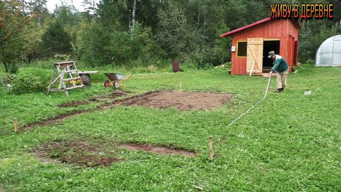 После того как вы определились с размером бассейна, нужно разметить его границу на участке. По углам забиваются колышки из рейки. Чтобы чаша бассейна получилась прямоугольной, расстояние между ними должно быть равным по обеим диагоналям.