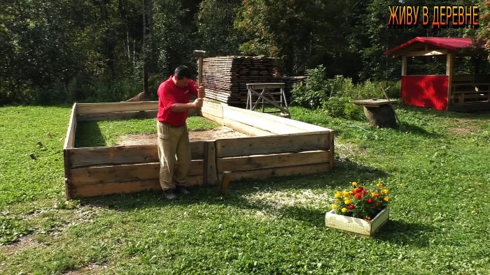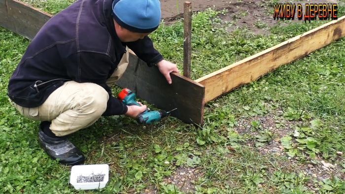 К колышкам прикручиваются или прибиваются гвоздями доски. Требуется собрать коробку высотой 60 см. Ряды каркаса дополнительно соединяются рейками. Нужно будет также проверить коробку по уровню, чтобы при наполнении чаши водой одни бортики не оказались выше остальных.