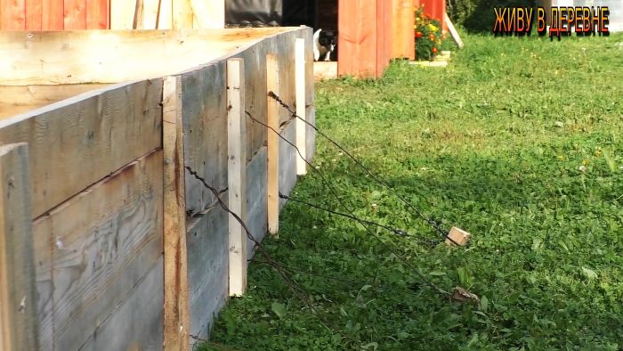 Затем необходимо забить за пределами каркаса колья, и связать их с коробкой растяжками из проволоки. Это нужно, чтобы грунт в дальнейшем, пока не будет залита вода, не выдавил его в котлован.