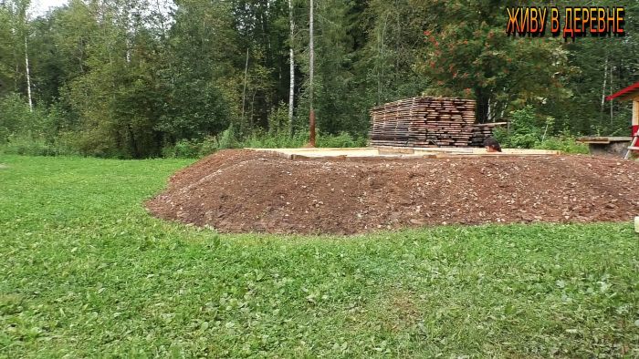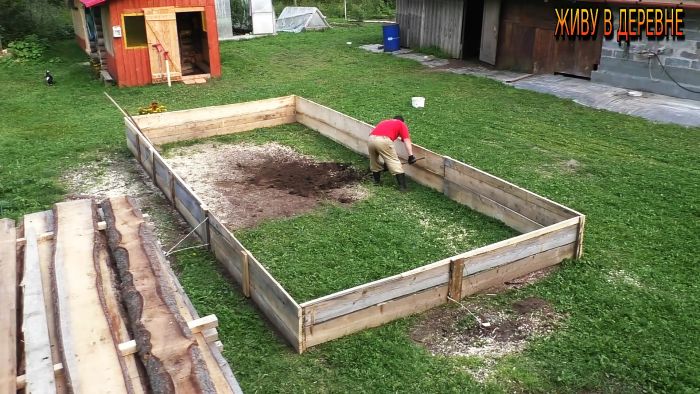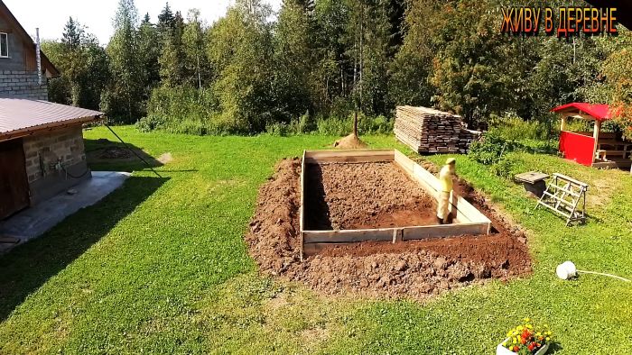 После этого нужно выкопать котлован в коробке. Земля при этом выбрасывается за борта, чтобы их подсыпать. Растяжки позволят коробке не выгибаться под весом грунта.