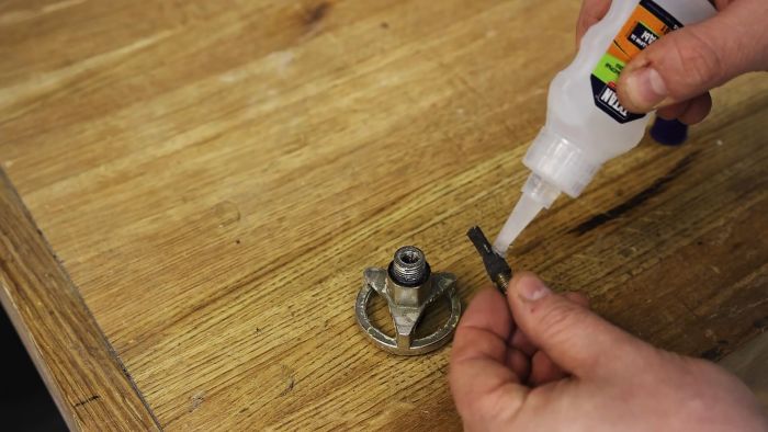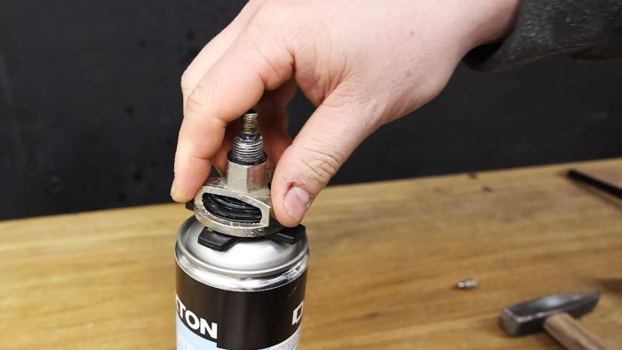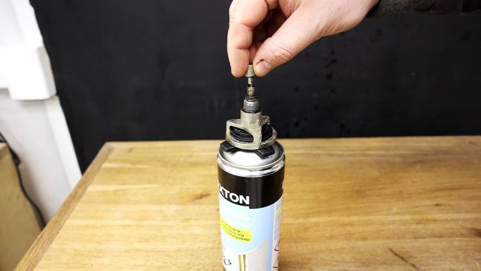 После схватывания клея, из него выкручивается золотник. Теперь модернизированный адаптер устанавливается на пустой баллон от смывки.