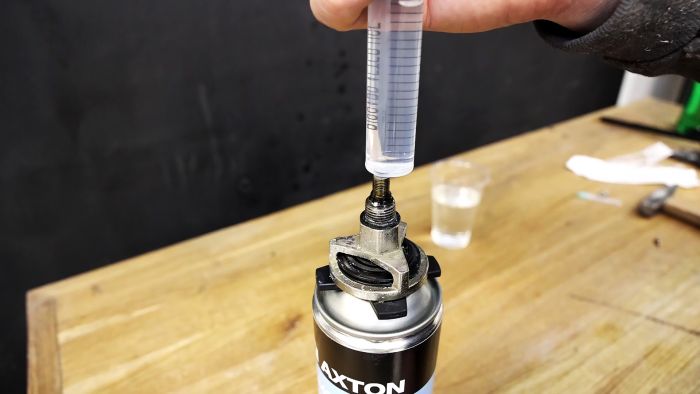С помощью шприца через него в баллон шприцем заливается ацетон.