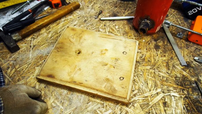 В удлиненные гайки на корпусе закручивают шпильки. Затем в куске фанеры просверливаются отверстия. В них вставляются шпильки, и фиксируются гайками. Таким образом, получается подошва, на которой горн может устойчиво стоять.
