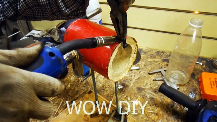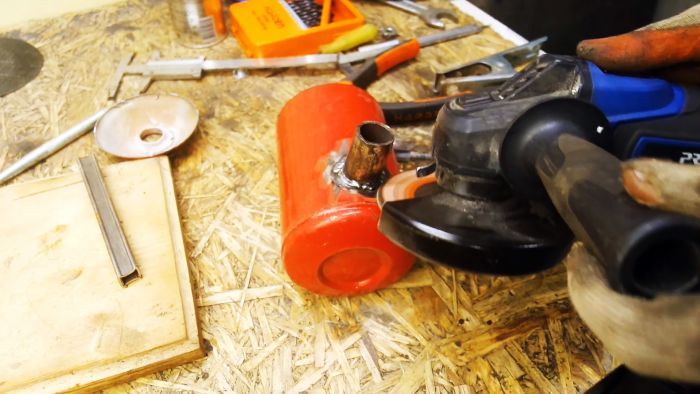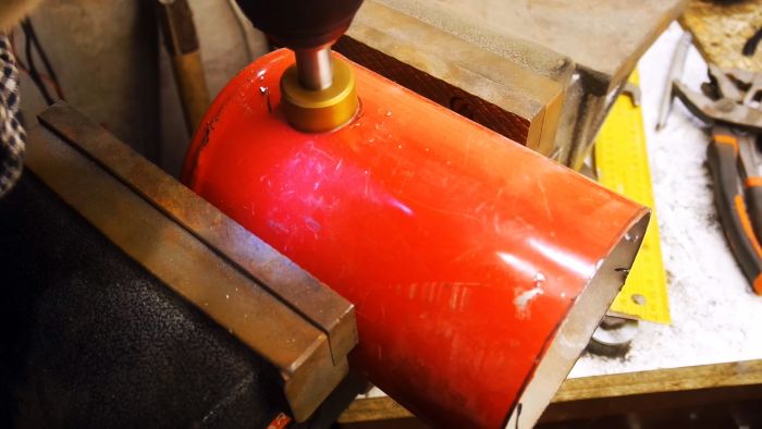 Немного выше дна корпуса огнетушителя просверливается отверстие под трубу 25 мм, от которой заранее отрезается заготовка длиной 10 см.