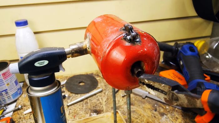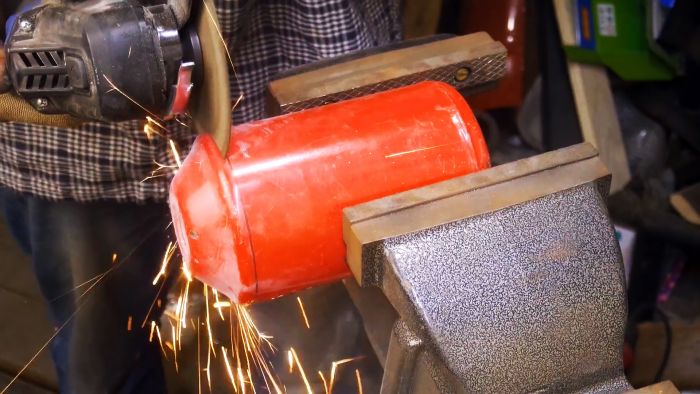 Первым делом нужно разобрать пустой огнетушитель. У него ровно отрезается горловина по заводскому сварочному шву.