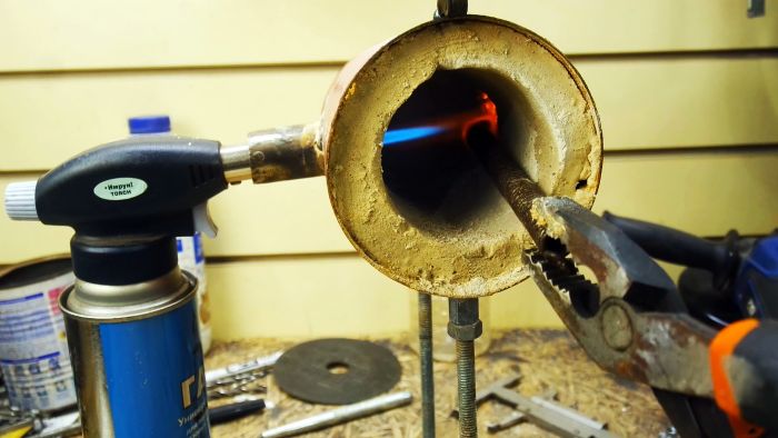 Чтобы воспользоваться горном, нужно вставить в приваренную трубку газовую горелку. Заготовка для термообработки помещается в камеру. Если размер позволяет, то это лучше делать через закрытое отверстие в крышке, так разогрев произойдет быстрее.