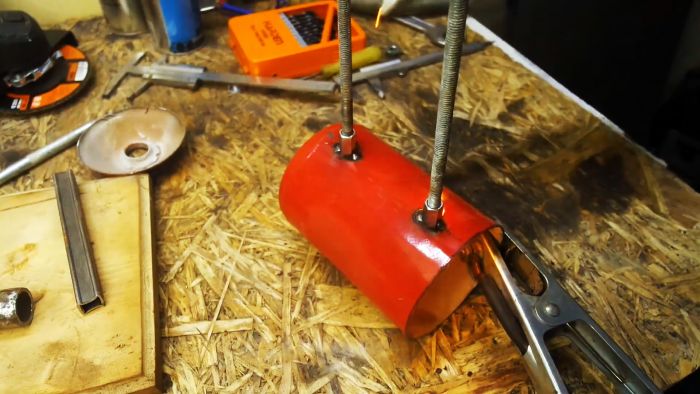 Для крепления стоек к корпусу огнетушителя приваривается 2 удлиненные гайки. Для удобства сварки в них можно сразу вкрутить шпильки. Также приваривается труба, вставленная на половину длины в отверстие.