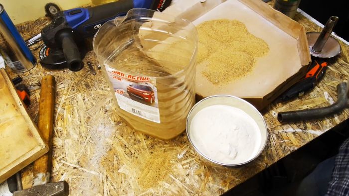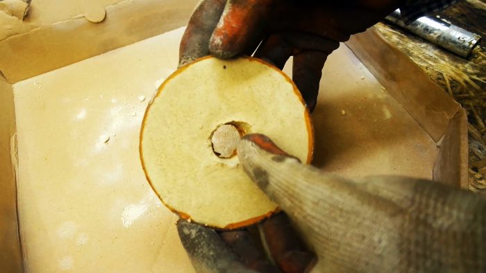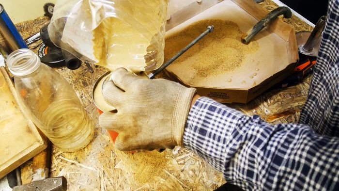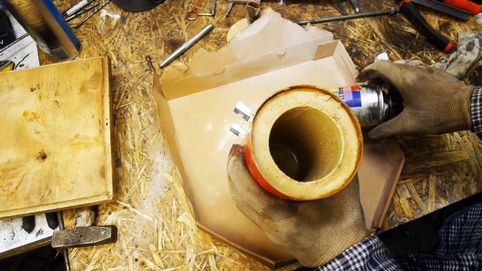 Теперь нужно зачистить сварочные швы. После этого следует заняться формированием камеры с огнеупорного материала. Для этого готовится раствор из песка и алебастра, смешанных в пропорции 1:1.