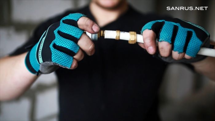 Далее требуется поставить на переходник металлопластиковую трубу. Для этого от него откручивается гайка и снимается кольцо. Их нужно поставить на трубу, после чего развальцевать ее край. Затем она присоединяется к переходнику.