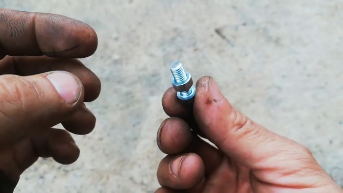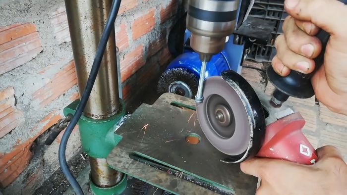 Стержень болта с гайкой под головкой вставляем в патрон сверлильного станка и болгаркой скругляем головку и гайку, а стержень укорачиваем.