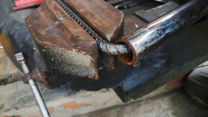 Инструменты: угольник и маркер, тиски, болгарка, труба, напильник по металлу, сварка, сверлильный станок, молоток.