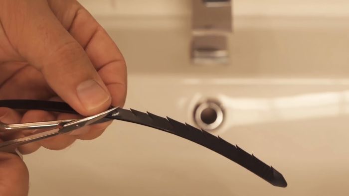 Для очистки потребуется сделать очень простой инструмент из кабельной стяжки. На ней делаются косые насечки с двух сторон ножницами или ножом. Направление реза должно идти от замка стяжки в сторону кончика ленты.