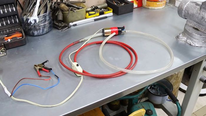 С помощью такой помпы можно перекачивать различное топливо (бензин, солярку) из канистры или другой емкости в топливный бак автомашины и наоборот. Также можно высасывать отработанное моторное масло из системы смазки двигателя без установки машины на яму или подъемник и необходимости откручивания сливной пробки. При этом в качестве источника питания мы используем автомобильный аккумулятор.