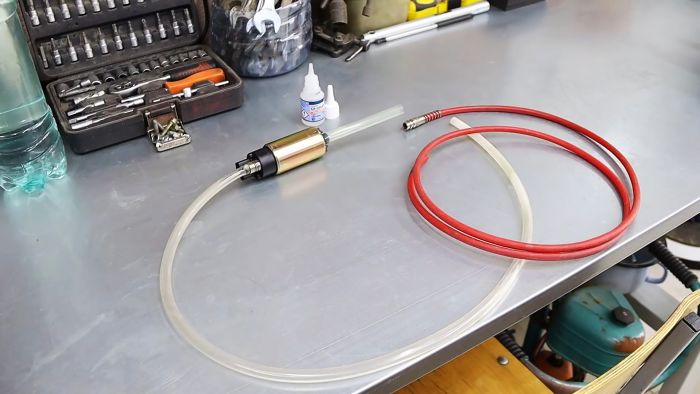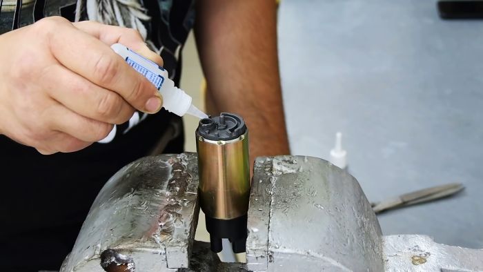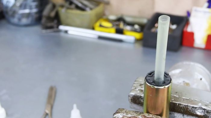 Закрепляем с помощью универсального цианакрилатного клея недлинную пластиковую трубку к входному отверстию топливного насоса, а подлиннее – к выходному.