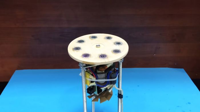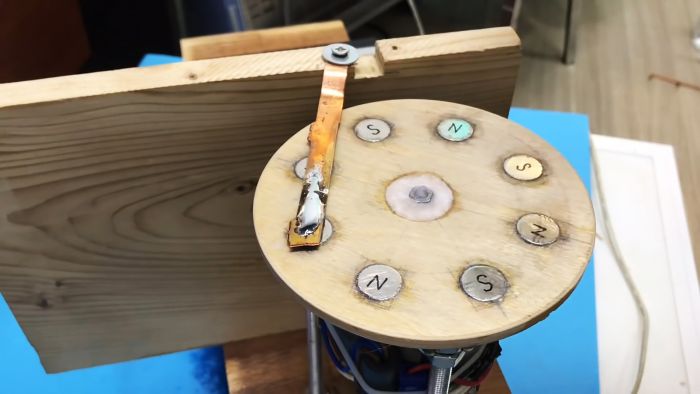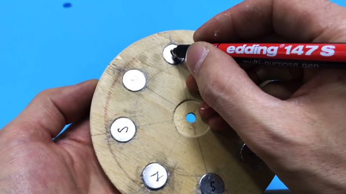 Из фанеры необходимо выпилить диск диаметром 15-25 см. Его нужно разметить для ровного размещения магнитов по окружности. Затем под них просвечивается посадочные места, и магниты вклеиваются в отверстия с чередованием полярности. В центре диска предусматривается отверстие, в которое вклеивается втулка для его размещения на валу электромотора.