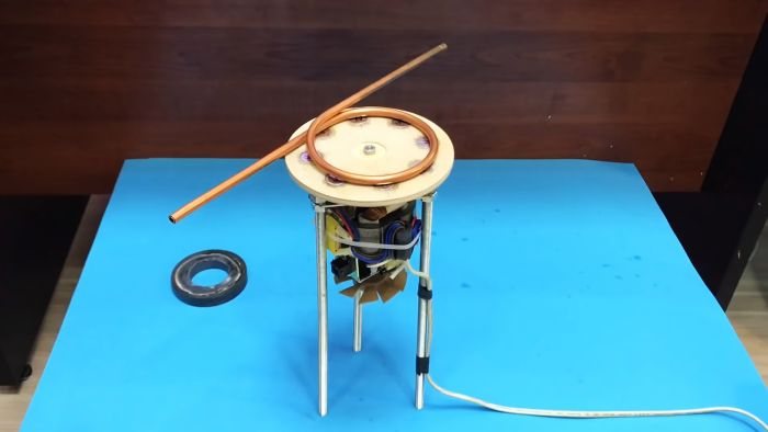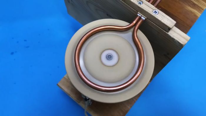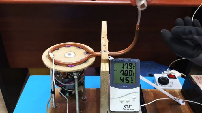Кольцо из медной трубки размещается над диском с магнитами с зазором в 2 мм. Для его крепления нужно сделать стойку из доски, и закрепить ее на подошву. Теперь при запуске двигателя трубка разогреется от магнитного поля. Чем быстрее обороты, тем сильнее нагрев.