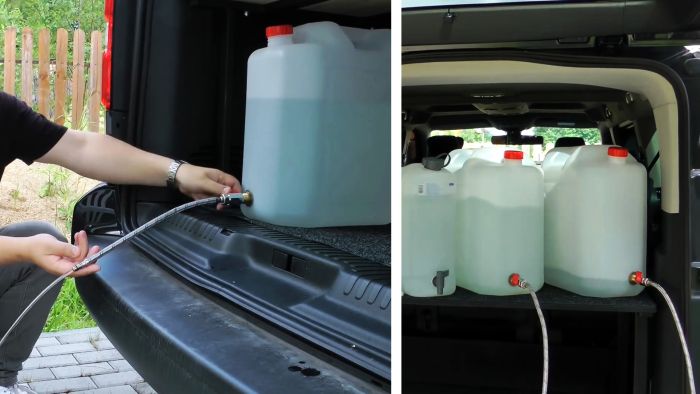 Теперь при необходимости можно воспользоваться водой из канистры, не вытаскивая ее из багажника. Достаточно конец шланга вывести за пределы машины и открыть кран. Воздух в канистру будет поступать по слегка отвинченной верхней крышке.