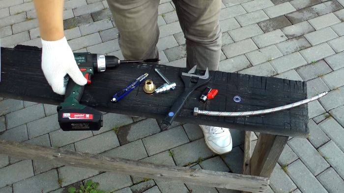 Инструменты: шуруповерт с перьевым сверлом, нож, ключ торцевой и разводной.