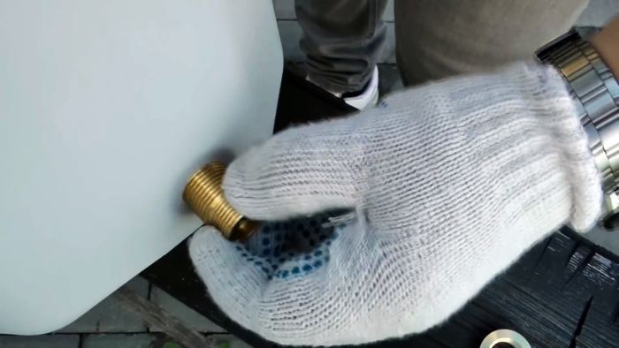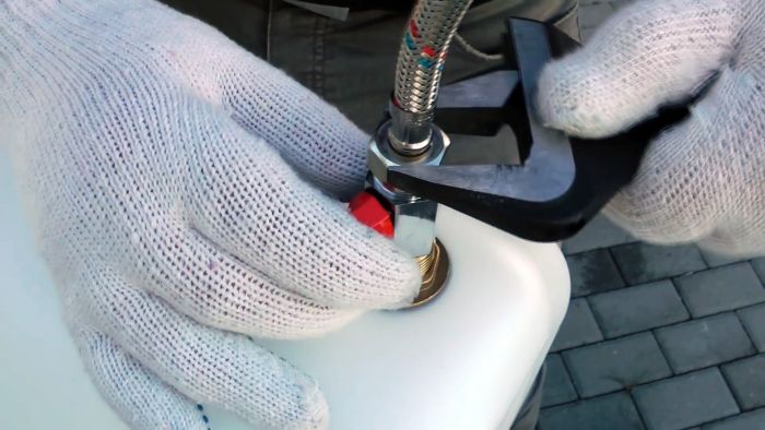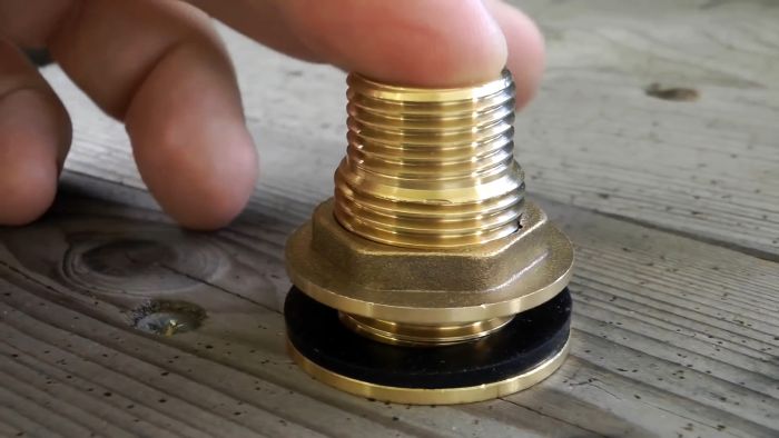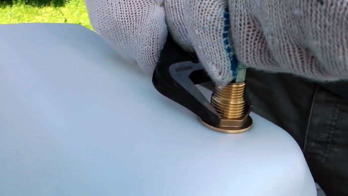 В горлышко емкости бросаем фитинг с надетой прокладкой, но без затяжной гайки. Потряхивая емкость, заводим штуцер в отверстие, и удерживая его торцевым ключом, затягиваем гайку.