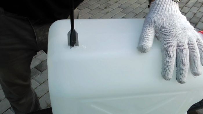 В нижней части канистры сверлим отверстие и ножом подравниваем кромки.