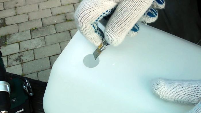 Процесс врезки крана в пластиковую емкость с узким горлышком