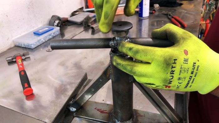 Вставляем во внутреннее отверстие подшипника так, чтобы прут уперся в нижнюю металлическую пластину. Докручиваем гайку вплотную до подшипника и свариваем.