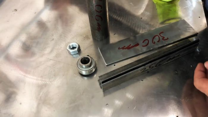 Привариваем подшипник к верхнему отверстию трубы. На прут с резьбой накручиваем гайку.