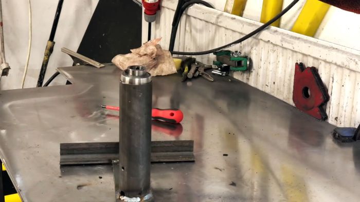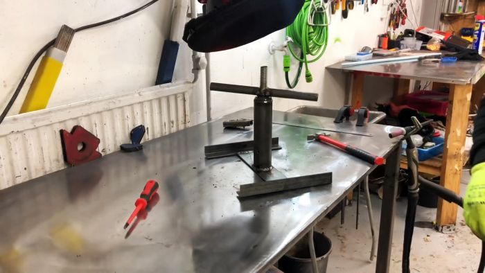 Прежде всего свариваем корпус будущего домкрата. Трубу, пластину и уголки ровно выставляем в конструкцию, где к обеим сторонам пластины присоединяются уголки, а по центру – труба.