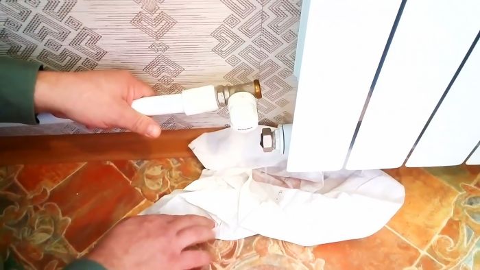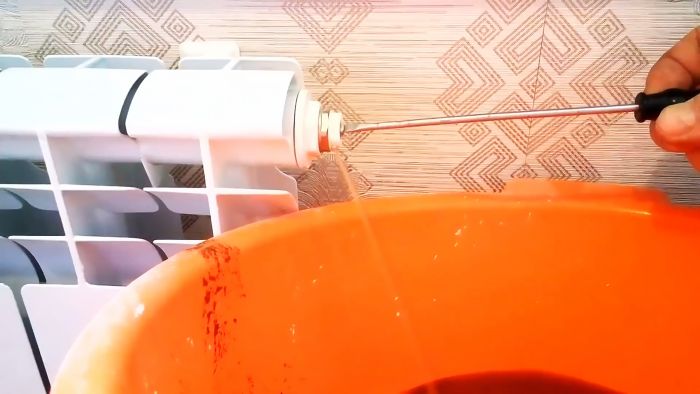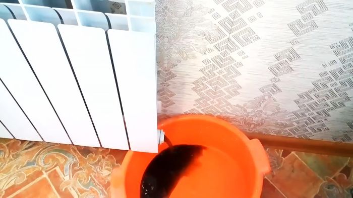 Чтобы модернизировать систему, необходимо для начала перекрыть подачу теплоносителя на батарею. Затем откручиваем разводным ключом ее нижнюю заглушку, чтобы его слить в подставленную емкость.