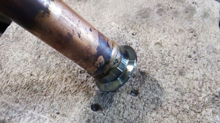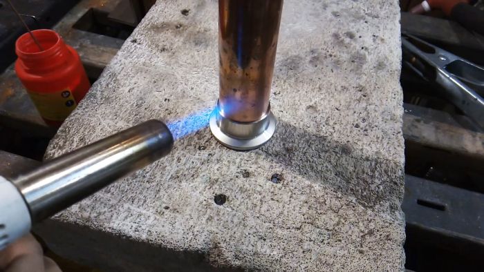 Устанавливаем кламповое соединение на огнеупорную поверхность (кирпич, газобетон и пр.) и прогреваем детали примерно до 800 градусов Цельсия с упором на разогрев медной трубы.