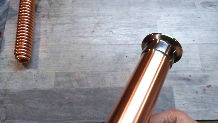 Тщательно зачищаем абразивной губкой для посуды спаиваемые детали – кламп из нержавейки и медную трубу. Затем эти две детали собираем, вставляя трубу во втулку.