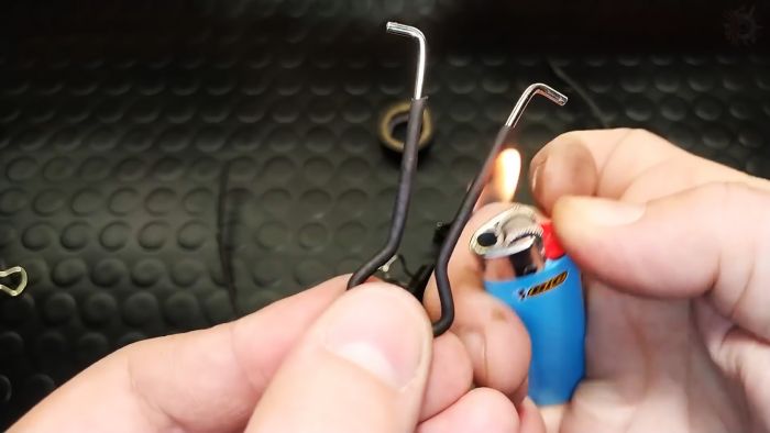 Снимаем ручку от самого большого зажима и надеваем на нее термоусадку. Пламенем от зажигалки фиксируем ее.