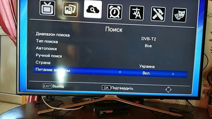 Если Вы сделали вариант с блоком, то можно стразу переходить к поиску каналов. Выбираем диапазон DTV-T2 (эфирные телеканалы) и производим поиск. Если у Вас вариант без блока, то перед поиском необходимо включить питание антенны в настройках.