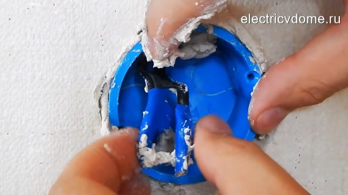 В подрозетнике выламываем одно боковое окошко. Просунув провода через это окошко, вставляем пластиковый стакан.