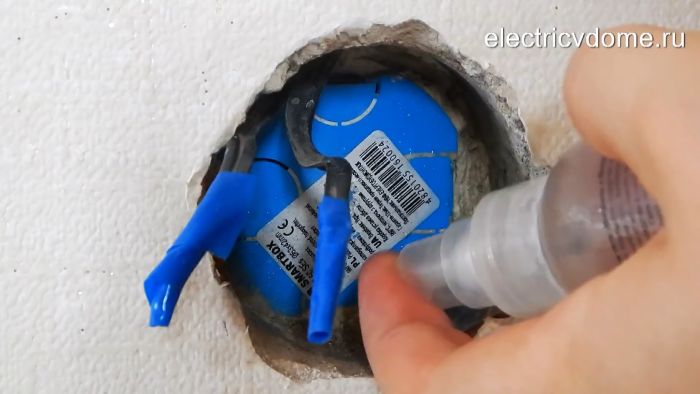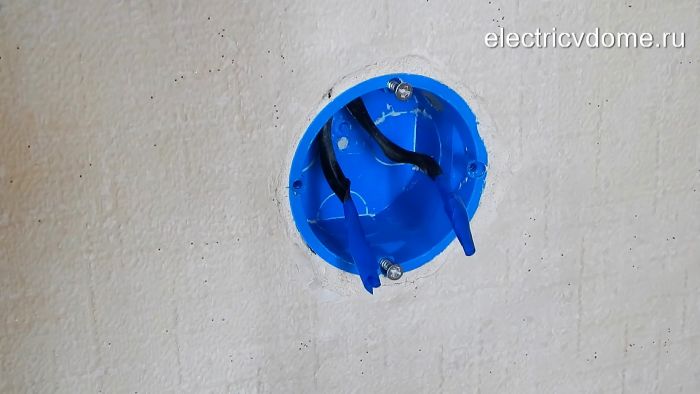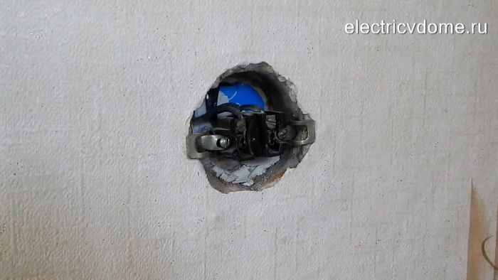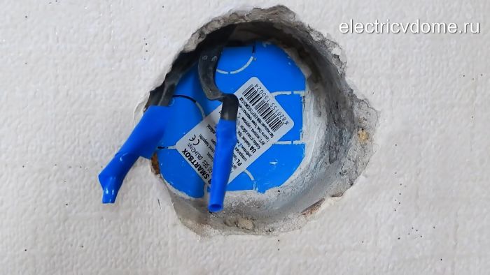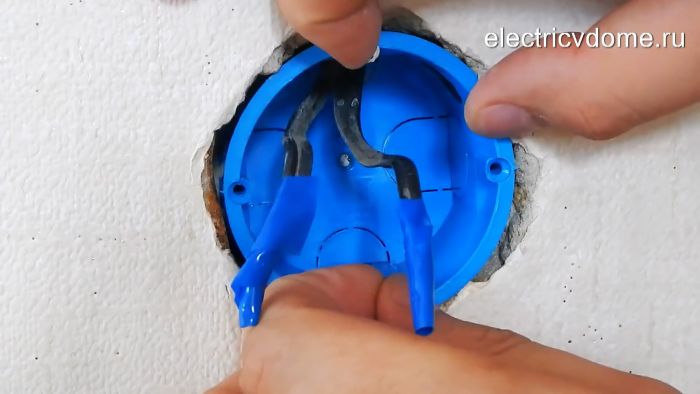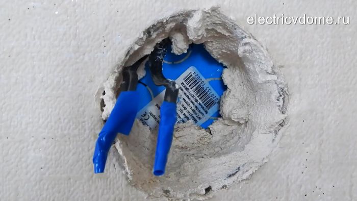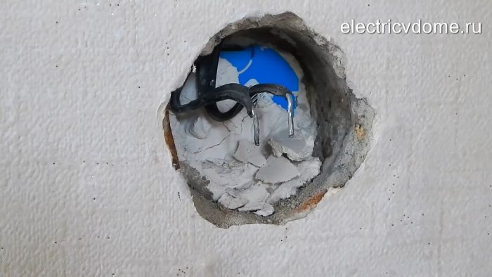 И теперь устанавливаем подрозетник в посадочное место, просунув провода. Стакан должен утонуть в гнезде заподлицо со стеной, выступ не допускается.