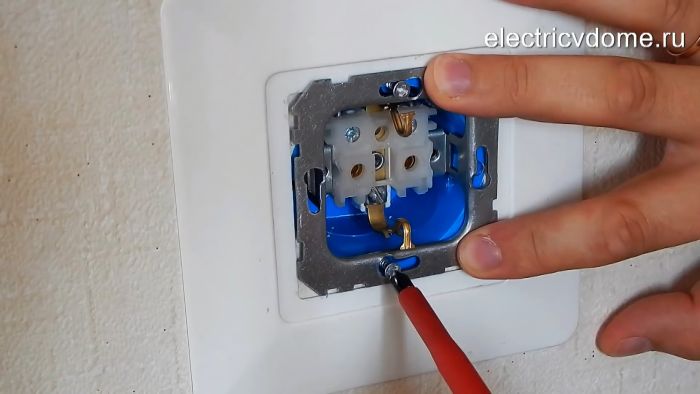Если имеется декоративная крышка, то не забываем ее установить. Проверив правильность установки розетки на отсутствие перекосов, устанавливаем крышку на место, зафиксировав винтом. Включаем питание в щитке и проверяем индикаторной отверткой наличие напряжения.