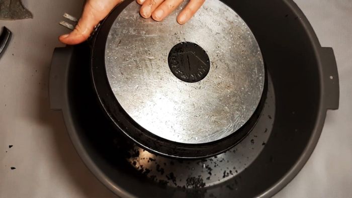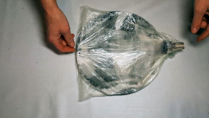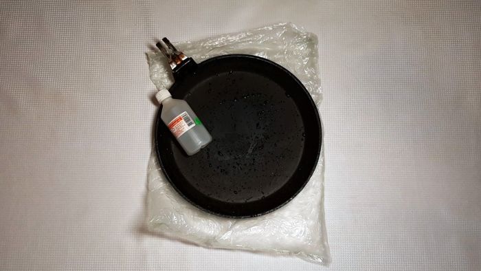 Затем сковорода помещается в полиэтиленовый пакет, и завязывается.
