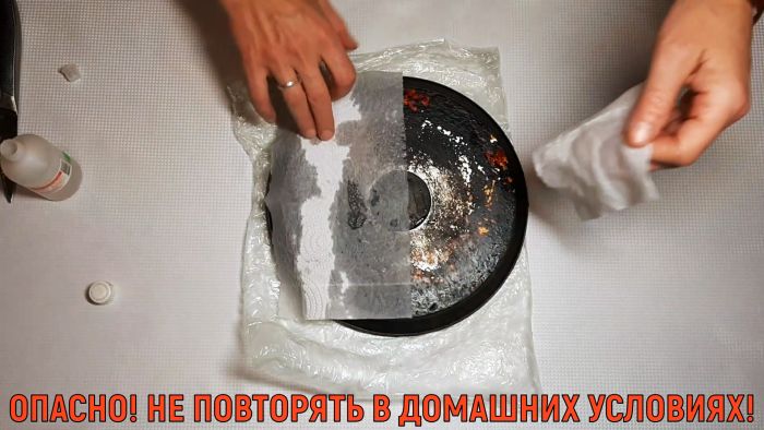 Данный метод подразумевает использование нашатырного спирта, поэтому работа лучше на улице или с включенной вытяжкой. Также не лишними будут резиновые перчатки и очки. Сковородку необходимо обложить бумажными салфетками, и пропитать их нашатырным спиртом. Нужно, чтобы весь нагар был перекрыт ими.