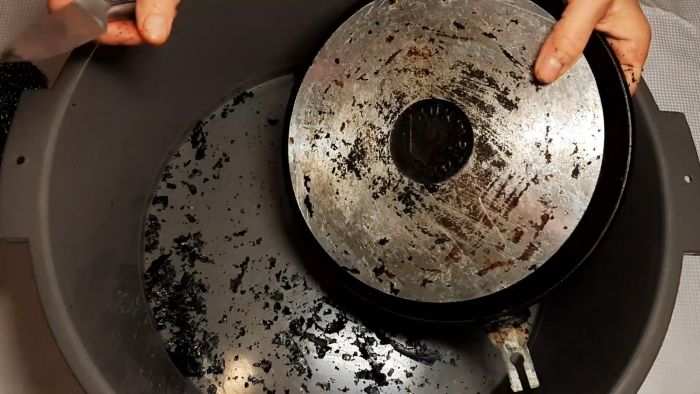 Спустя сутки сковородка вынимается, и салфетки убираются. Нагар под спиртовым компрессом будет очень легко соскребаться. Достаточно просто потереть его скребком или ножом.