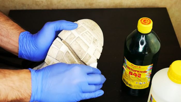 После этого насухо вытираем и даем высохнуть. Затем берем ватный тампон и наносим на него растворитель. Протираем трещину подошвы несколько раз. Данную операцию необходимо делать в перчатка, так как обезжиренную трещину голыми руками лучше не трогать, во избежании попадания жиров с кожи.